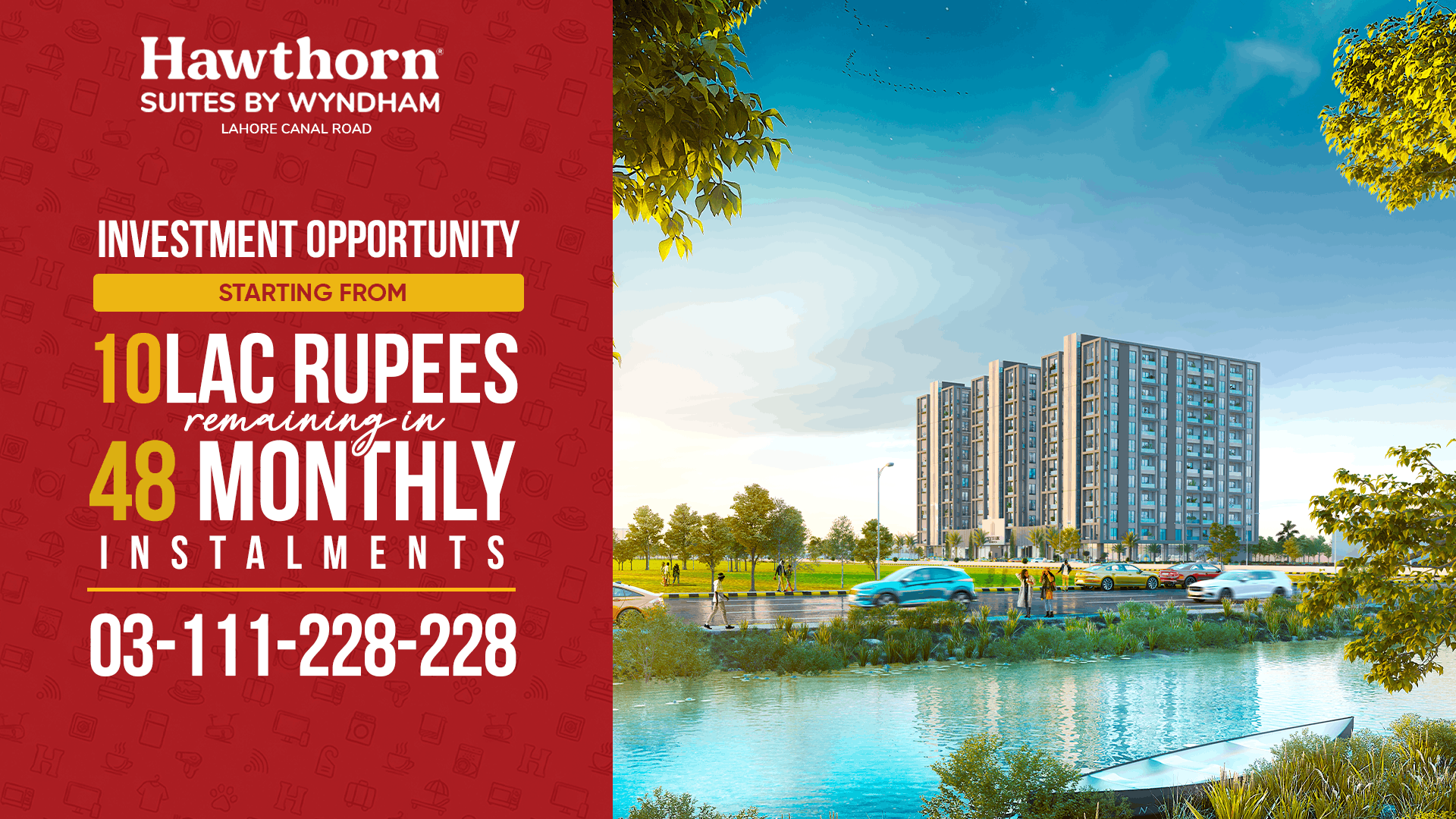 Invest at pre-launch rates in Hawthorn Suites by Wyndham Canal Road Lahore, starting from just PKR 10 lacs, with PKR 42,000/month. Prices set to revise at launch.
